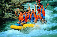 此段漂流全程約需5個(gè)小時(shí),也可以只漂半程,那是從哈尼宮到泥路河大橋這一段,需要三個(gè)小時(shí)。如果是全程漂流,到達(dá)猴兒跳后,會(huì)有游船載開往芙蓉鎮(zhèn),全程約需2個(gè)小時(shí)。如是早上開始漂,可以漂全程,然后去芙蓉鎮(zhèn)上游玩;如果是下午開始漂,就只來(lái)得及漂半程了。漂流時(shí)一般6至10人乘一艘皮筏,每人均會(huì)穿上救生衣,船由當(dāng)?shù)佤构,所以有驚無(wú)險(xiǎn)。