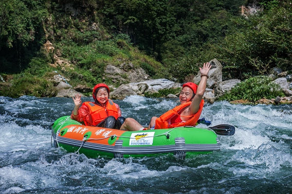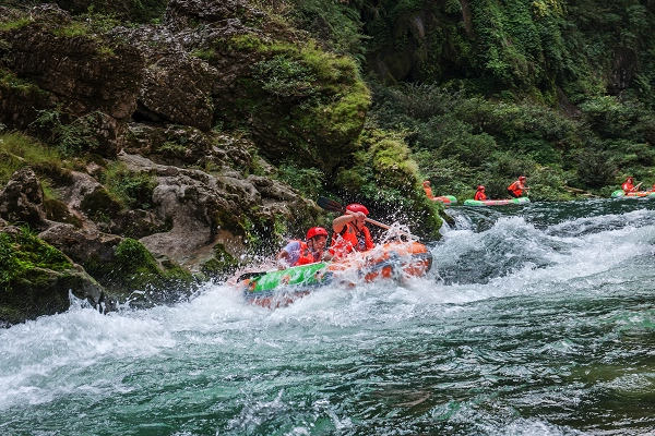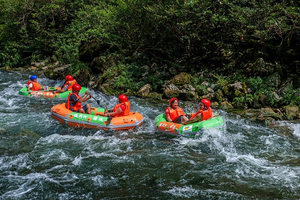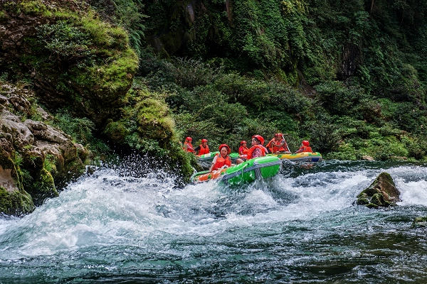 猛洞河水量豐富,河流坡降大,水急灘多浪奇,高大的峭壁直插水面,兩岸并相靠攏,形成幽深的峽谷景觀。沿河兩岸古木蒼天,蒼翠欲滴,奇石錯(cuò)落,流泉飛瀑隨處可見,下游一路水碧山青,風(fēng)光秀麗,野猴成群,溶洞奇特。猛洞河天下第一漂項(xiàng)目位于猛洞河支流,全長(zhǎng)47公里,最精彩處位于哈妮宮至牛路河段,長(zhǎng)約17公里。該景區(qū)兩岸多為原始次森林,蔥蔥郁郁,水流湍急,碧綠清亮,有十里絕壁,十里瀑泉,十里畫卷,十里洞天的美譽(yù)。其中有急流險(xiǎn)灘108處,大小瀑布20處。漂流,穿急流,越險(xiǎn)灘,闖狹谷,捕激浪,有驚無(wú)險(xiǎn),回味無(wú)窮。特別是哈妮宮、三角巖、雞籠門、遇仙峽(捏土)、閻王灘、落水坑、夢(mèng)思峽、鯉魚剖肚、三大炮等景點(diǎn),無(wú)不令人叫絕觀止。