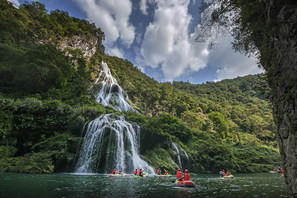 猛洞河漂流,起點(diǎn)哈妮宮距王村約40公里,行車1小時(shí),終點(diǎn)牛路河距王村30分鐘的車程,漂流水路長(zhǎng)17公里,漂流兩個(gè)半小時(shí)。從哈妮宮放舟而下,一路是古老的河道,絕壁百里,怪石嶙峋,灘奇水異,兩岸蒼翠的林木,云霧繚繞,飛瀑流泉與溶巖峰林交相輝映。拐一百五十五個(gè)彎,在一百三十三個(gè)灘潭中穿梭而行,迂回流連,馳魂奔魄,心曠神怡。