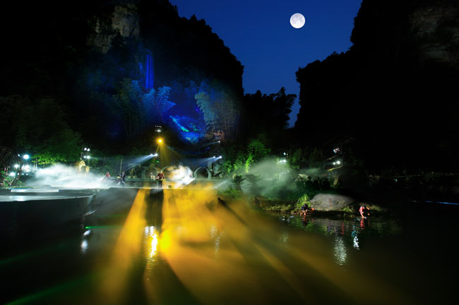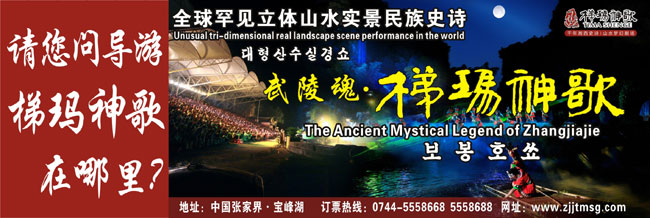 The Ancient Mystical Legend of Zhangjiajie 《武陵魂•梯瑪神歌》是一場(chǎng)記述土家族起源、演變、戰(zhàn)爭(zhēng)、生產(chǎn)生活等內(nèi)容的大型立體山水實(shí)景演出,揉合了音樂(lè)、舞蹈、文學(xué)等多種藝術(shù)形式,如幻如夢(mèng)的舞美燈光,搖曳生姿的原生態(tài)歌舞……濃縮了土家族數(shù)千年的發(fā)展歷史,400多名演員以自然淳樸的表演充分的展示了土家的民族文化特征,給游客帶來(lái)了耳目一新的感受。一場(chǎng)視聽(tīng)的饕餮盛宴,一曲驚天地、泣鬼神的曠世古歌,給人山水文化光影視聽(tīng)的享受。【出品:張家界梯瑪神歌文化傳播有限公司】