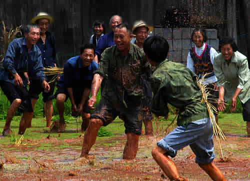 插秧活動的最后一天,叫做“關(guān)秧門”。一丘田里,聚集了很多幫忙插秧的人,大家心里都憋著一股勁,看誰秧插得最快。速度慢人往往會被插得快的人圍住,最后關(guān)在秧田中間出不來,這叫“關(guān)豬籠”。這時候,速度快的人就會走上田埂,抓起稀泥團(tuán)朝被關(guān)了豬籠的人扔去,也有專門砸主人一身稀泥的,岸上也有人澆水。主人身上被砸的稀泥越多,主人越高興。在關(guān)秧門的最后時刻,人們會在田野里上演一場你追我趕的游戲,土家人把它叫做“糊倉”。在“糊倉”的過程中,誰也不會記仇,大家你追我趕,場面極其熱鬧。