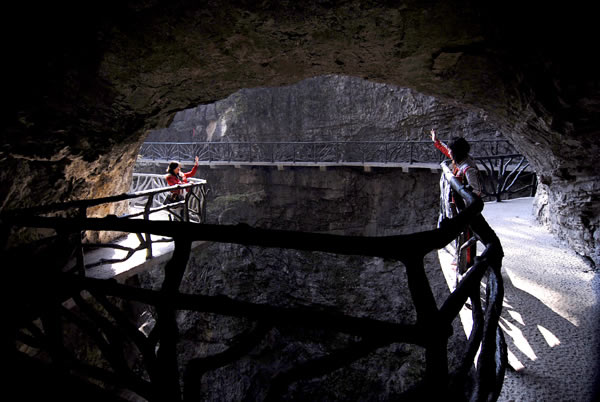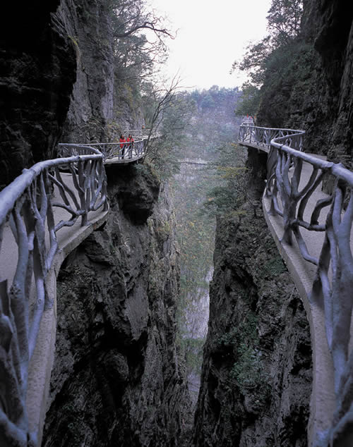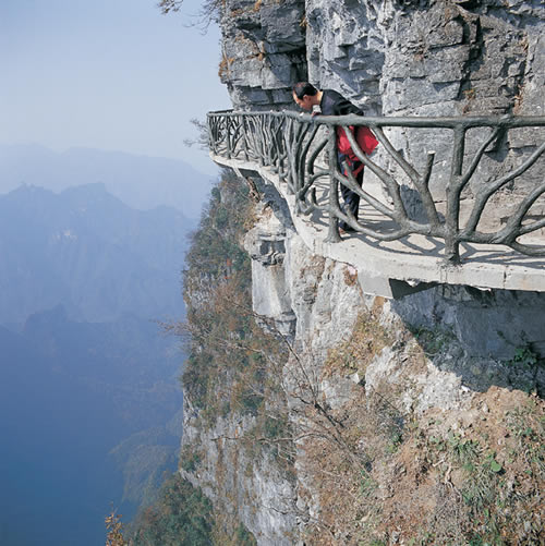據(jù)施工人員介紹,此條棧道也是他們所修棧道中施工最難,最險(xiǎn)峻的一條。如果您還覺(jué)得不夠刺激的話,在棧道的完結(jié)處的兩個(gè)懸崖之間有一條長(zhǎng)160米的懸索吊橋,同時(shí),在海拔最高點(diǎn)還有一個(gè)挑戰(zhàn)心里極限的玻璃站臺(tái),在這里,如果你能挺直腰板伸開(kāi)雙臂,那么,您就是真正的勇士了。