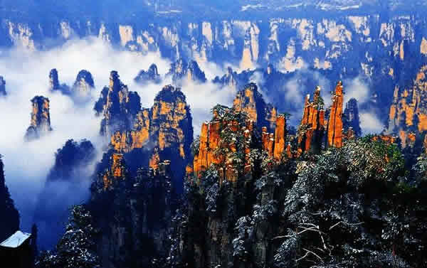 御筆峰 御筆峰被公認為是武陵源砂巖大峰林風光的標志景點,不斷出現(xiàn)在海內(nèi)外各種媒體和宣傳品上面,堪稱天下一絕。本來,這是大自然鬼斧神工的神來之筆,科學上講是歲月風化、浸蝕、切[1]削的結果,但民間卻把它與向王天子聯(lián)系在一起,說是向王天子殉難后,他的御筆化成石峰,廝守在神堂灣邊;而裝御筆的“簽筒”、“筆架”則留在水繞四門。然而,千古興亡,時代更迭,“古今多少事,都付笑淡中”。只有這支“御筆”還在!在詩人眼中,好用它來寫瀟瀟灑灑的霧,寫多姿多彩的云,寫火一般熱烈的朝霞,寫夢幻般純潔的月光,寫“高處不勝寒”的冰雪世界。當然,也可以寫您熱戀這方山水或者熱戀某位紅顏知己的情詩。