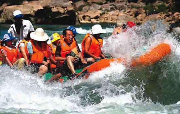 河水更為兇悍強(qiáng)勁,昂頭撤蹄,湍湍東去。一灘連一灘,一浪挽一浪。百里河流百里灘,百里流水百里浪。茅巖河水無(wú)情地撞擊著河中根基深厚的礁石,盡管撞擊得頭破血流,斷腸裂肺,粉身碎骨,依然無(wú)怨無(wú)悔,從不停歇地演繹著生命的壯觀。被撕碎的生命化成點(diǎn)點(diǎn)銀珠拋上天空,繼而又落回永不消逝的軀體上,織就了一幅生生不息的王母娘娘灑降甘露圖。而被河水沖撞了千百年仍然傲然屹立的礁石,撕破了河水剛剛要向人展示玉脂般的肌膚,又被洶涌而至的河水淹沒(méi),再次擊起滿(mǎn)天銀花。前進(jìn)與阻擋相搏發(fā)生的巨大轟鳴,在河谷里一次又一次的回響,在群山中一次又一次地震蕩。若乘坐皮筏或小舟在河上漂流,一種無(wú)以言狀的享受游走在每根神經(jīng)。人時(shí)而被軟若無(wú)骨的河水拋上浪尖,時(shí)而又被它牽扯著跌入峰谷。會(huì)不由自主地發(fā)出享受大自然賦予的刺激的無(wú)險(xiǎn)驚叫。尖叫聲與浪濤聲匯成了一支歡樂(lè)的樂(lè)章。