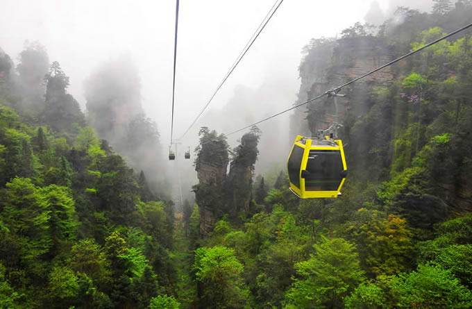 楊家界風光 楊家界索道是世界自然遺產(chǎn)武陵源風景名勝區(qū)繼天子山索道、黃石寨索道后的第三條客運索道,上站位于八里坡游覽線劉家檐,下站位于中湖鄉(xiāng)野溪鋪村。該索道采用法國玻瑪索道設(shè)備,是世界頂級雙回路循環(huán)式配置八人車廂式索道,全長1876米,上下站垂直高差517米,線路支架14個,最高運行速度6m/s,最大運力為2300人/小時,單程運行時間5.2分鐘,是目前國際最先進的客運索道。