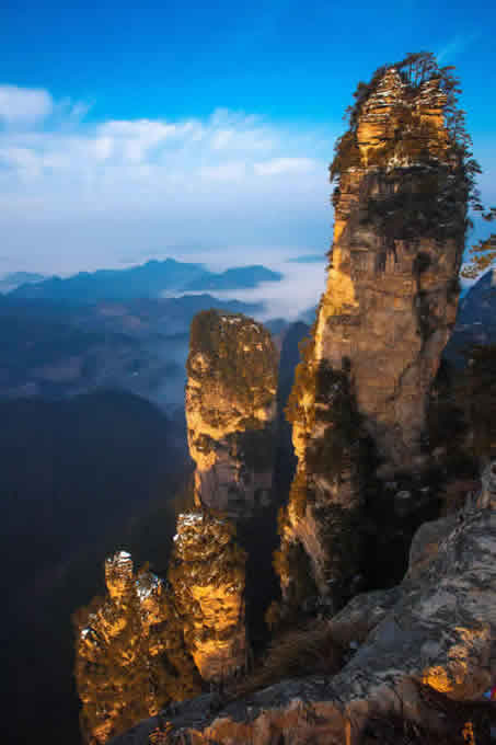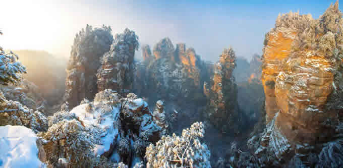 楊家界雪景 作為世界自然遺產(chǎn)武陵源四大核心景區(qū)之一的楊家界景區(qū),地勢險要,風景絕美,跟張家界、天子山、索溪峪比較,其中的地質(zhì)地貌一部分相同外,又有其獨特的資源優(yōu)勢,擁有全球罕見的峰墻群奇光。乘坐在舒適的楊家界索道里,可以盡情體驗“會當凌絕頂,一覽眾山小”的居高臨下與動感,360度暢游夢想般的楊家界仙界,俯瞰“近在咫尺”的千山萬壑,山舞銀蛇,千嬌百媚的絕美“峰墻”盡收眼底,無限風光在險峰,數(shù)十道氣勢如虹的石墻,一排排層巒疊嶂,相對平行而立,高矮參差不齊,宛如“天然長城”,真是美輪美奐,絕景天賜,不得不讓人驚嘆大自然的璧山開地之功。