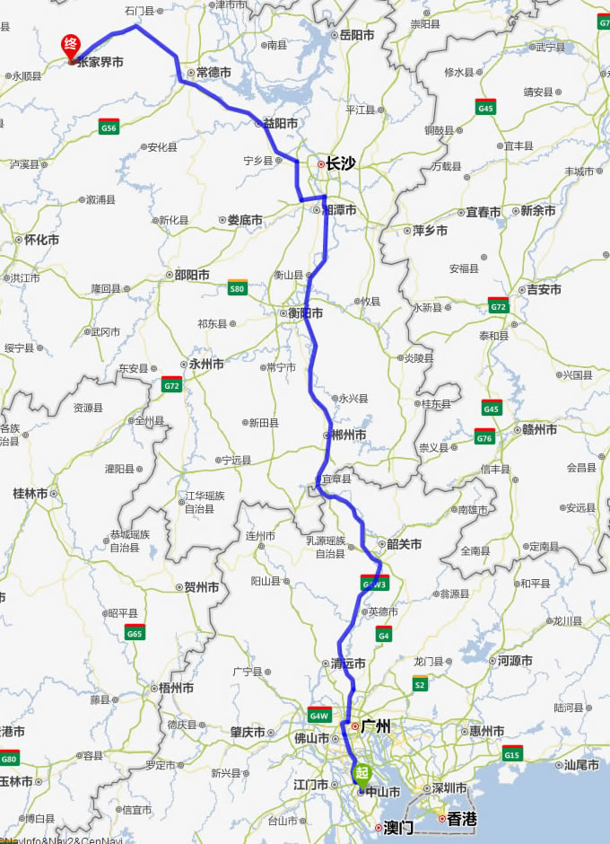左右,沿途經過江門——佛山市——廣州市——清遠——英德市——韶關市——樂昌市——宜章縣——郴州市——耒陽市——衡陽市——湘潭市——寧鄉(xiāng)縣——益陽市——常德市——慈利縣——張家界。