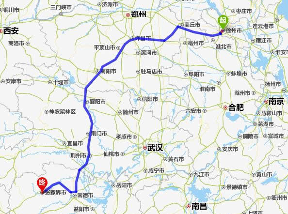左右,沿途經過徐州——商丘——許昌——平頂山——南陽——襄陽——荊門——荊州——常德(也可以走國道經澧縣、石門縣)——慈利——張家界。
