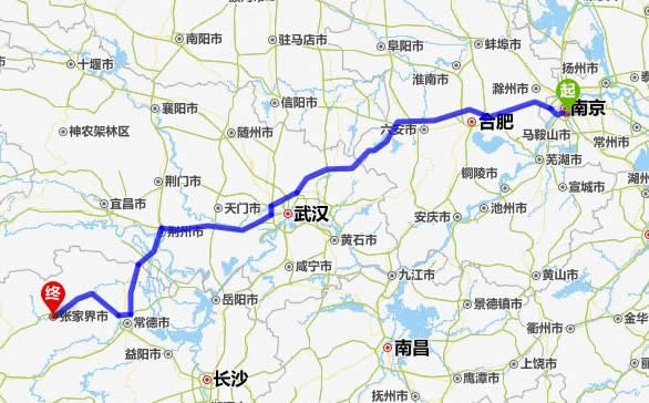 左右,沿途經過江寧——合肥——六安市——麻城市——仙桃市——潛江市——荊州市——常德市(這里可以不走常德,直接從荊州經澧縣、石門縣到慈利縣)——慈利縣——張家界。