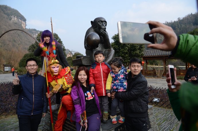 手持金箍棒,頭戴紫金冠。2月2日,農(nóng)歷臘月二十四,中國傳統(tǒng)小年節(jié)氣。當(dāng)天下午,旅游勝地張家界武陵源黃龍洞景區(qū),一名“美猴王”打扮的特殊游客現(xiàn)身“后天”雕塑、龍宮大廳、花果山等景點(diǎn),其惟妙惟肖的“孫悟空”動作表演,不時引來其他游客的驚呼:大圣歸來!